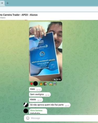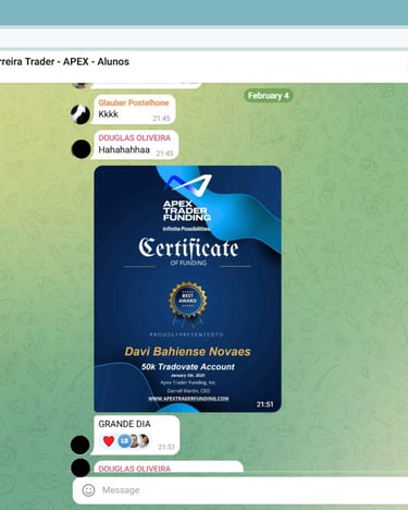 Com o suporte do grupo, conquiste sua aprovação nos testes da Apex Trader Funding.