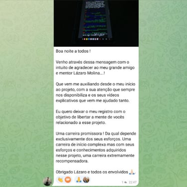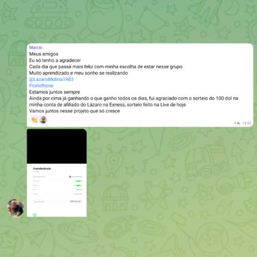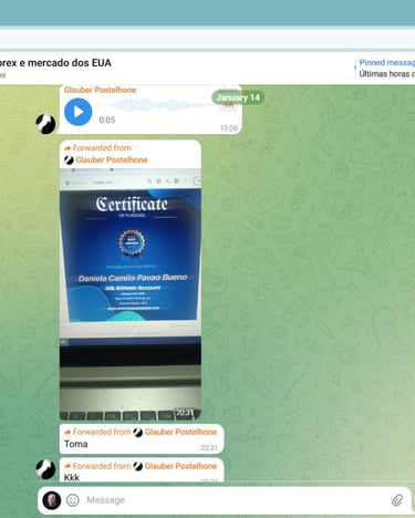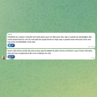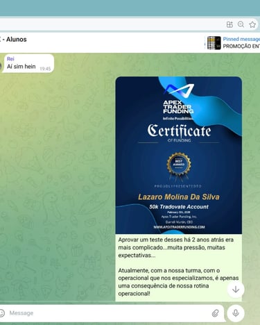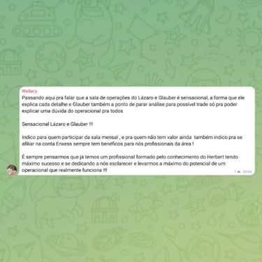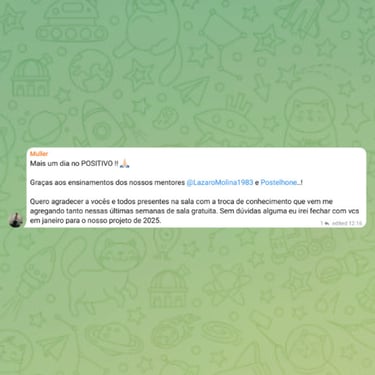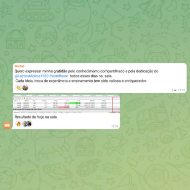 Grupo ativo com outros traders em evolução. Troca de ideias, dúvidas respondidas e suporte constante.